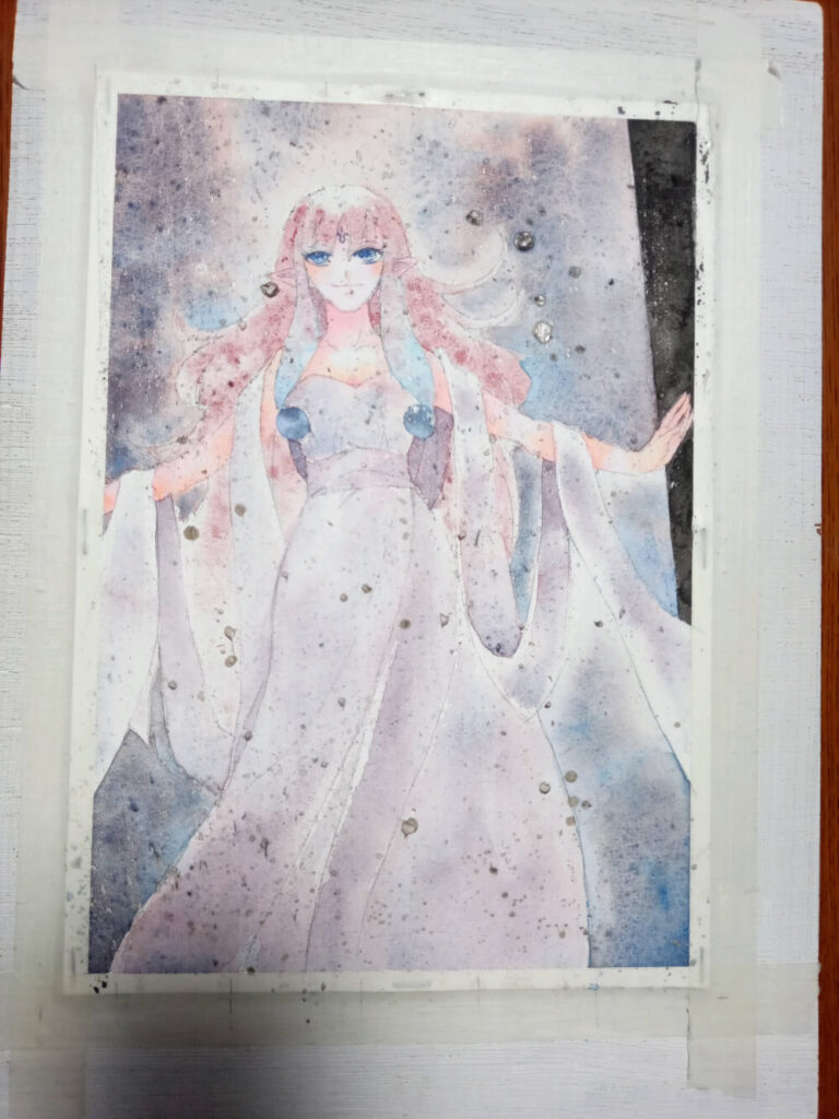 背景はハルモニアの分離色ファントムミスト、キャラの服は同じくダスクスカイで塗りました。