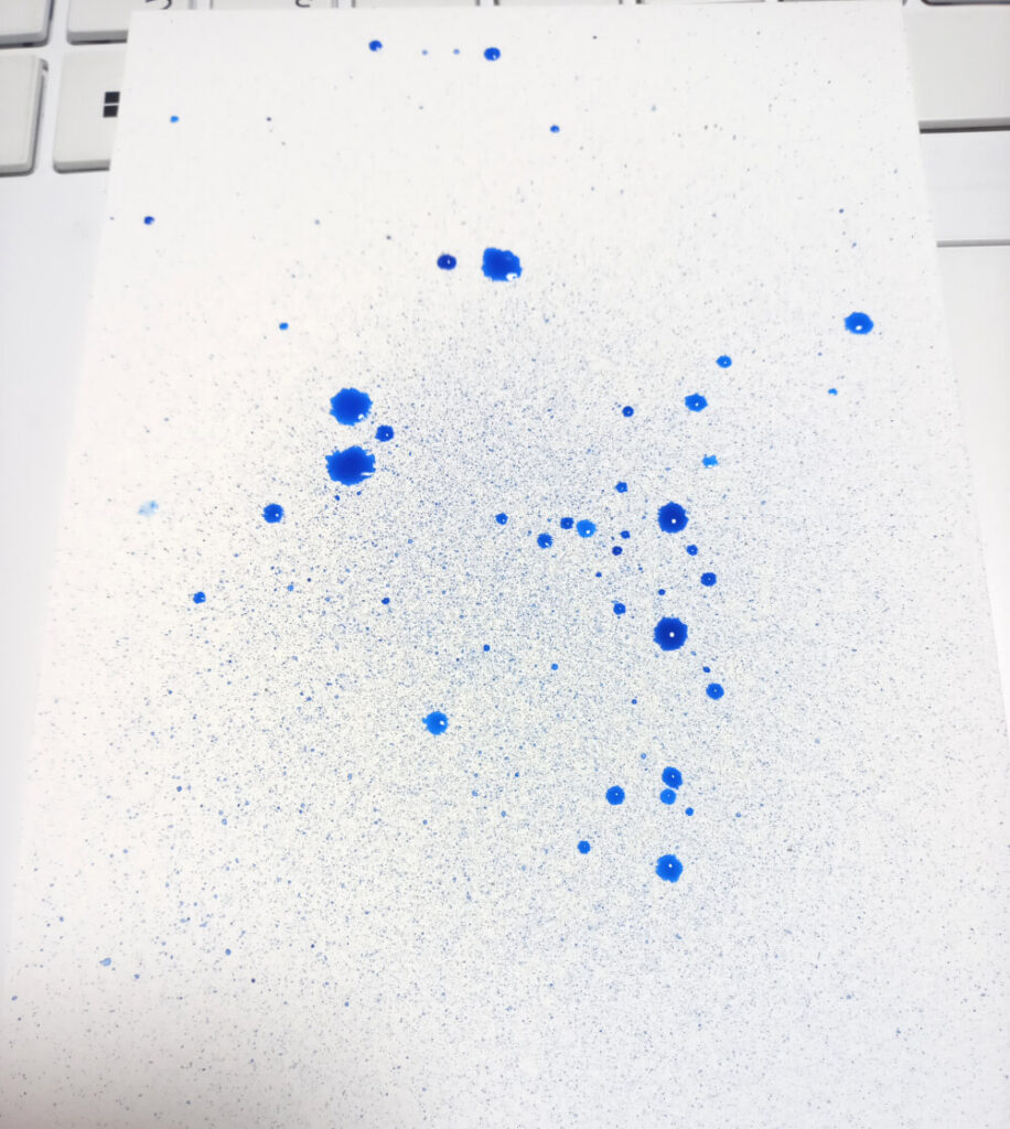 青い絵具を溶いてブラシにつけてばらまいてみました。